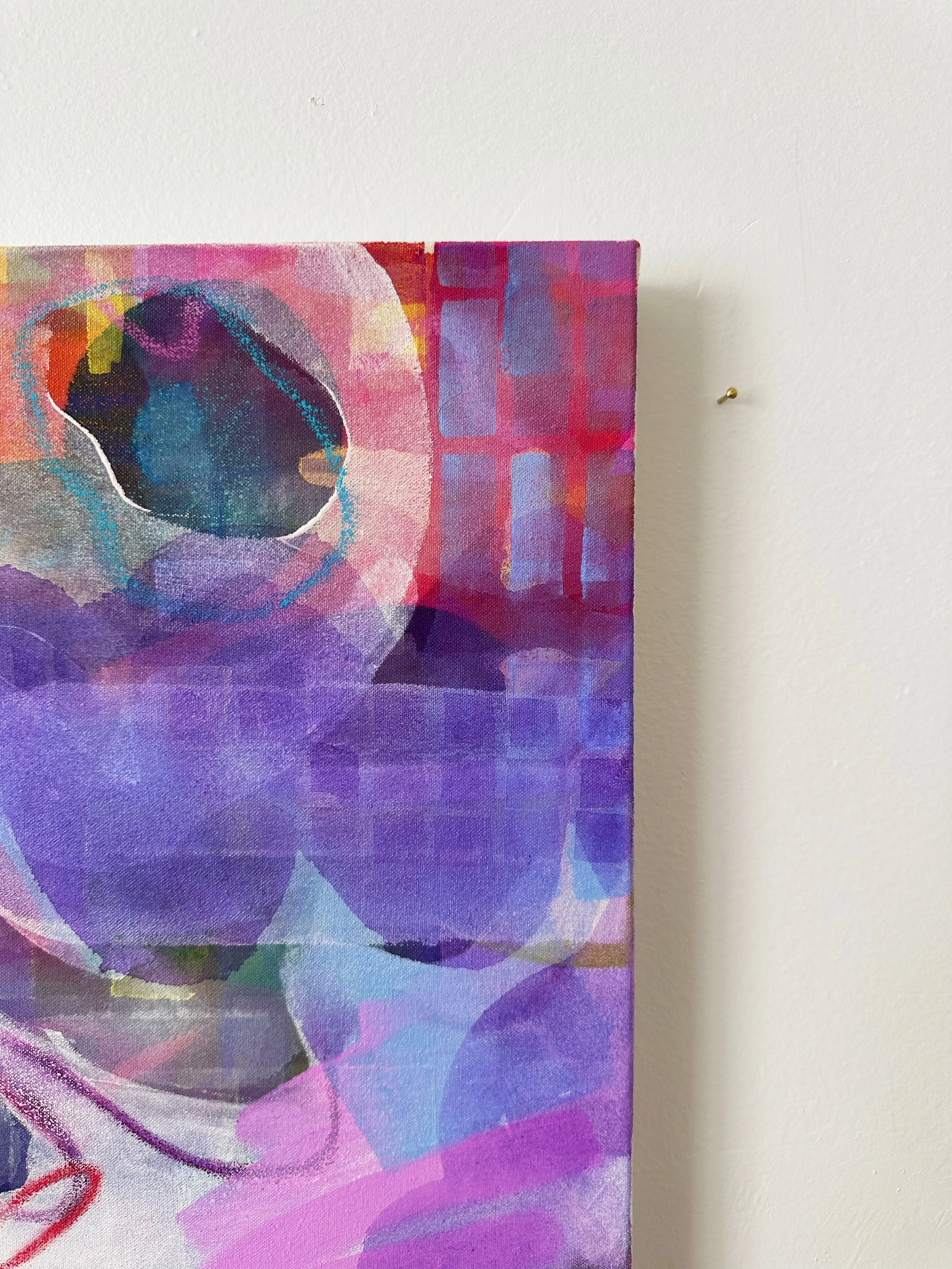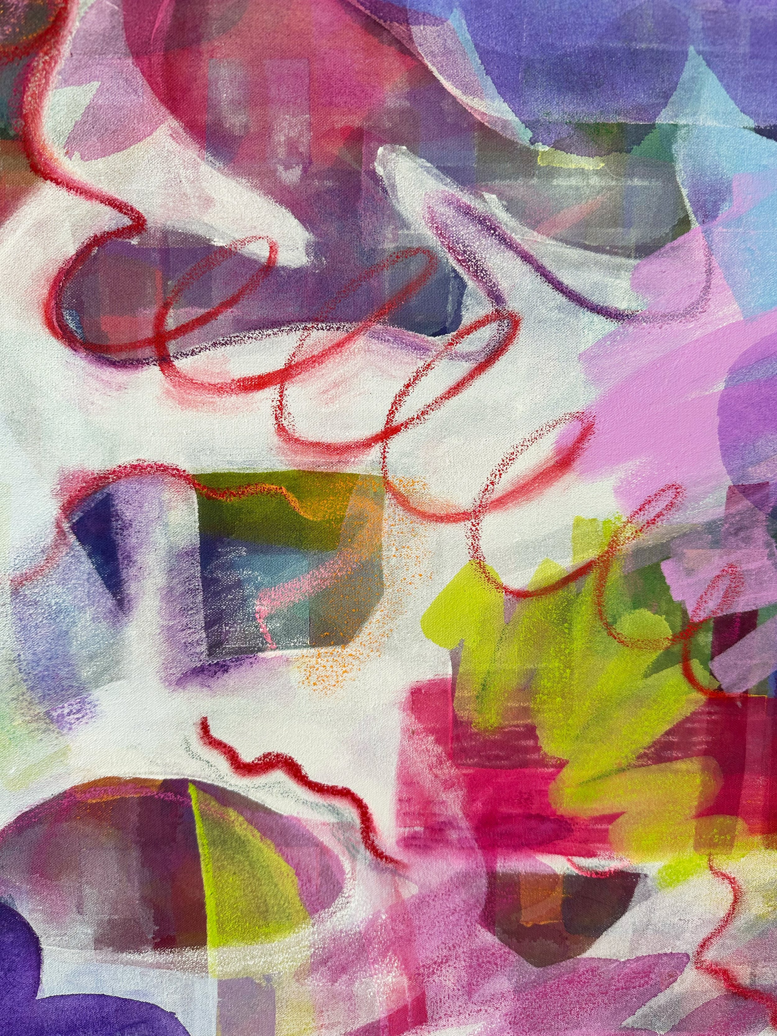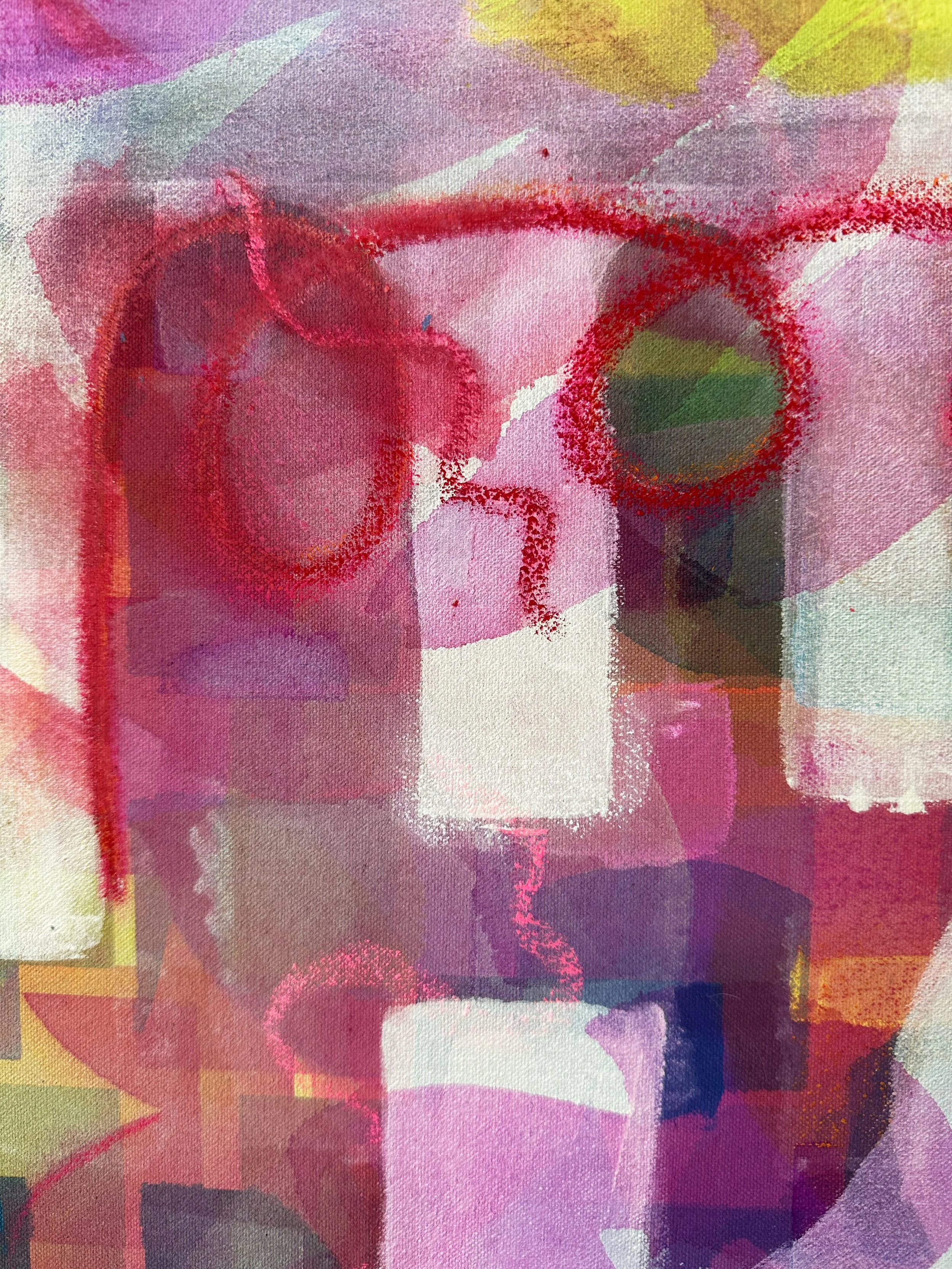 In “Red String Of Fate” I’m embracing childlike mark making and material application while pondering the concept of fate, soulmates and connection.