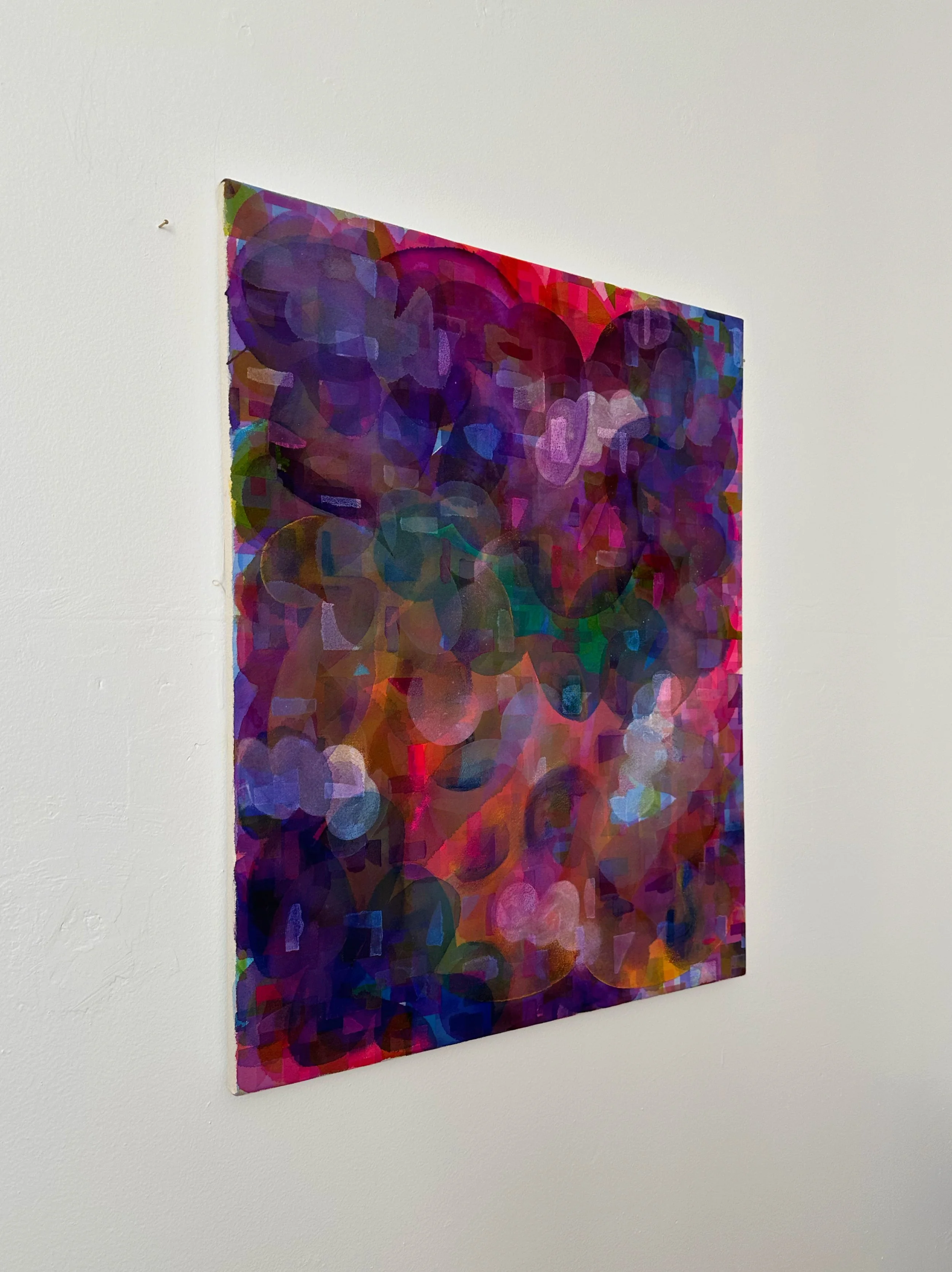 This painting was created through a process of working on both sides of the canvas simultaneously. I had noticed that the way I saturate the canvas in my paintings leaves an interesting bleed on the back of the piece. I wanted to use that as a way of working intentionally & play with it as a new level of depth. See the process below.
